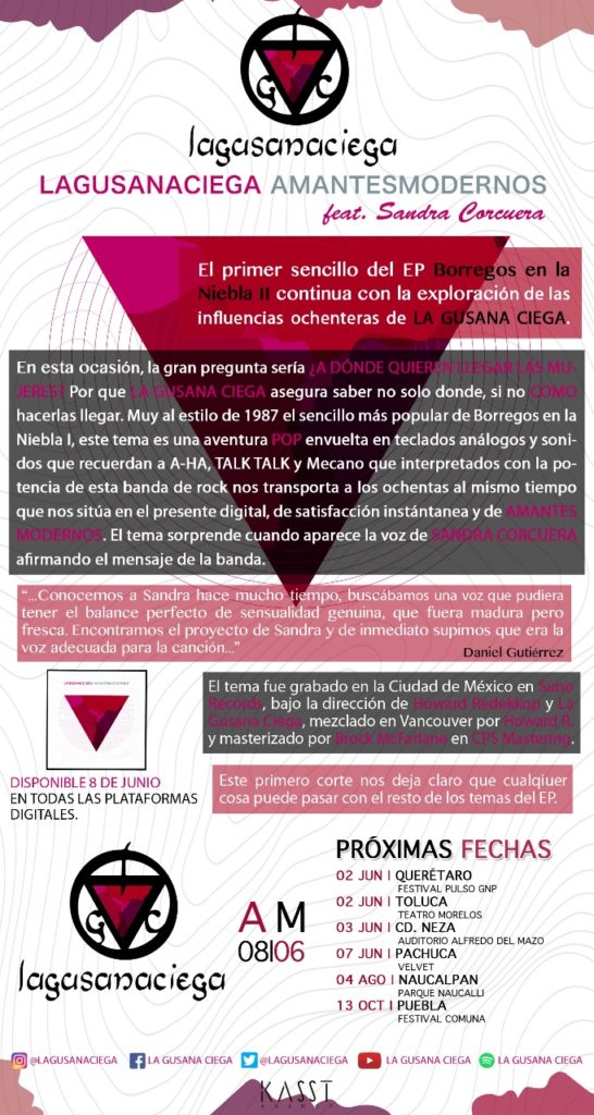 El día de hoy salió el nuevo sencillo de La Gusana Ciega, “Amantes Modernos”, en la cuál se realiza una colaboración con Sandra Corcuera.